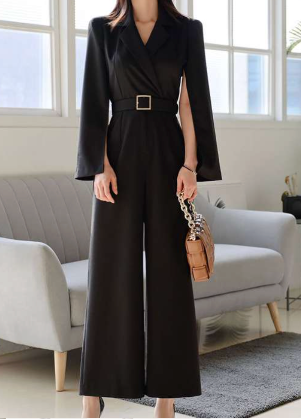 こちらのワイドパンツスーツは、クールで知的な印象を与えるデザインです。