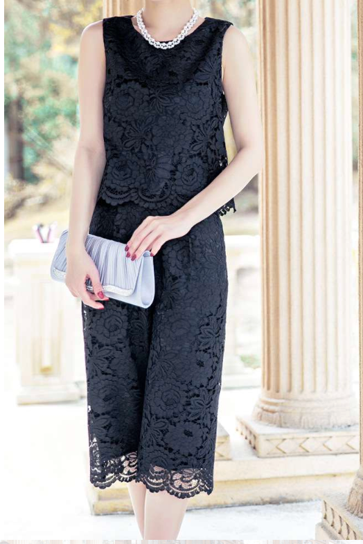 レース素材を贅沢に使用したセットアップスタイルのパンツドレス。
