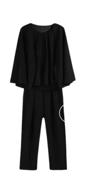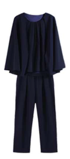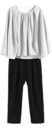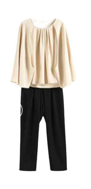 上品なデザインのバットスリーブトップスとスリムパンツのセットアップ。オフィスからカジュアルまで幅広く活躍。