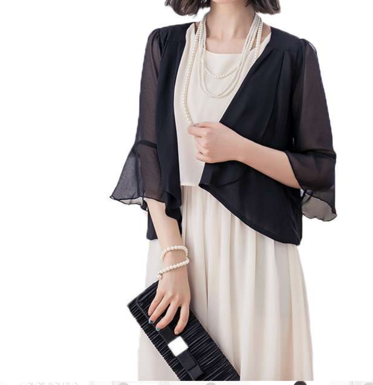 洗練された八色展開のパゴダスリーブボレロ。どんな装いにもマッチし,特別な日にふさわしい上品さをプラスします。