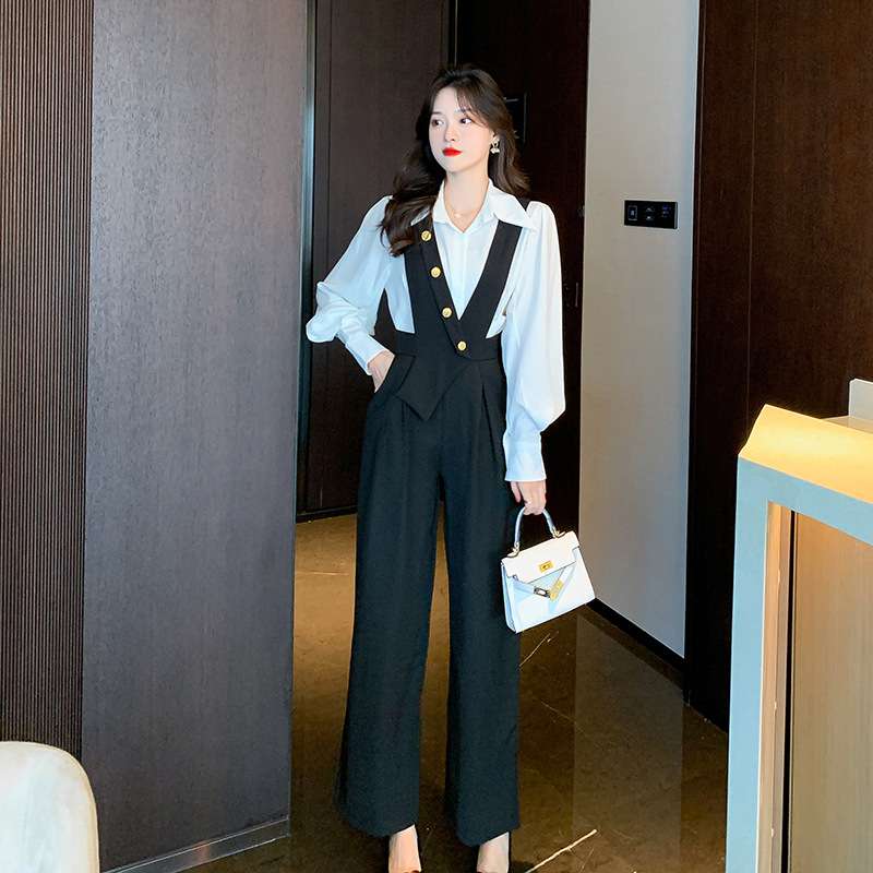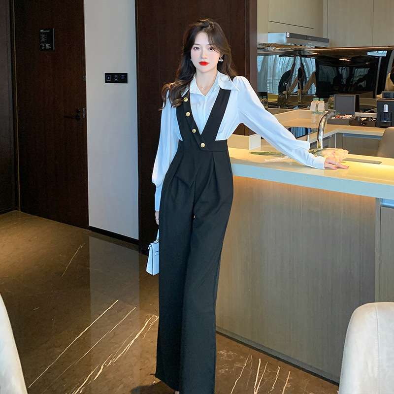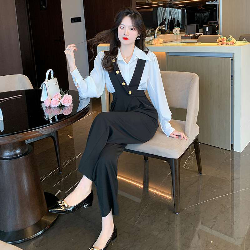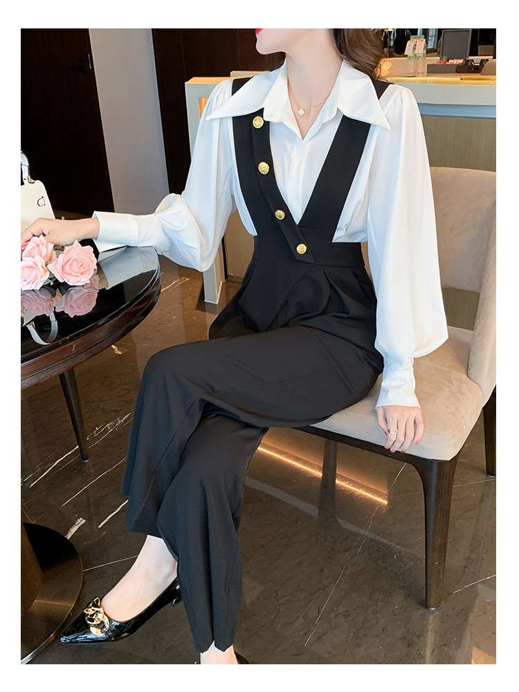 ブラウスとサスペンダーパンツの組み合わせで、おしゃれなレイヤードスタイルが簡単に完成
