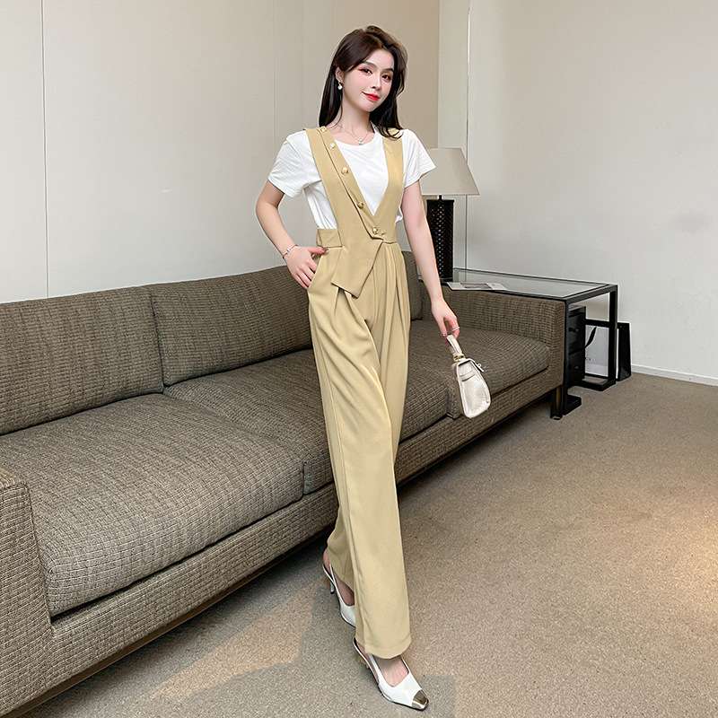 シックな吊りパンツとクラシックな白シャツを組み合わせた洗練されたデザイン。ゴールドボタンがアクセントとなり、華やかさを演出。幅広のパンツ裾が足長効果を生み、パーティーシーンで存在感を放つ一着です。