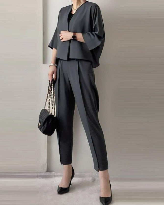 洗練されたデザインの七分袖ジャケットとテーパードパンツのセットアップ。ゆったりとしたシルエットで動きやすく、フォーマルな場面にぴったり。上品な雰囲気を演出する理想的なパーティーウェア。アクセサリーや小物で個性を出せます。