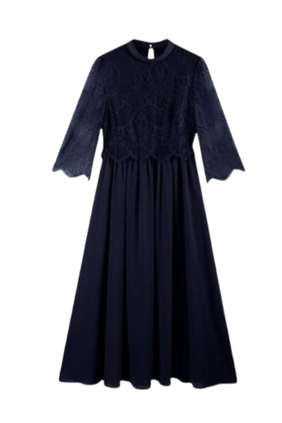 レイヤード風デザインがおしゃれな結婚式お呼ばれドレスレイヤード風ロングドレス。シースルー素材が優雅な雰囲気を演出し、上品さと品のある魅力を引き出します。ロング丈のシルエットが大人の女性らしさを際立たせ、特別な日の美しさを彩ります。