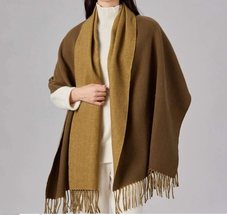 柔らかな肌触りのウールブレンド素材を使用した、大判のケープ風ストール。フリンジ付きで高級感があり、幅広い着こなしに対応。寒い季節に重宝する、上品で暖かみのあるデザインです。