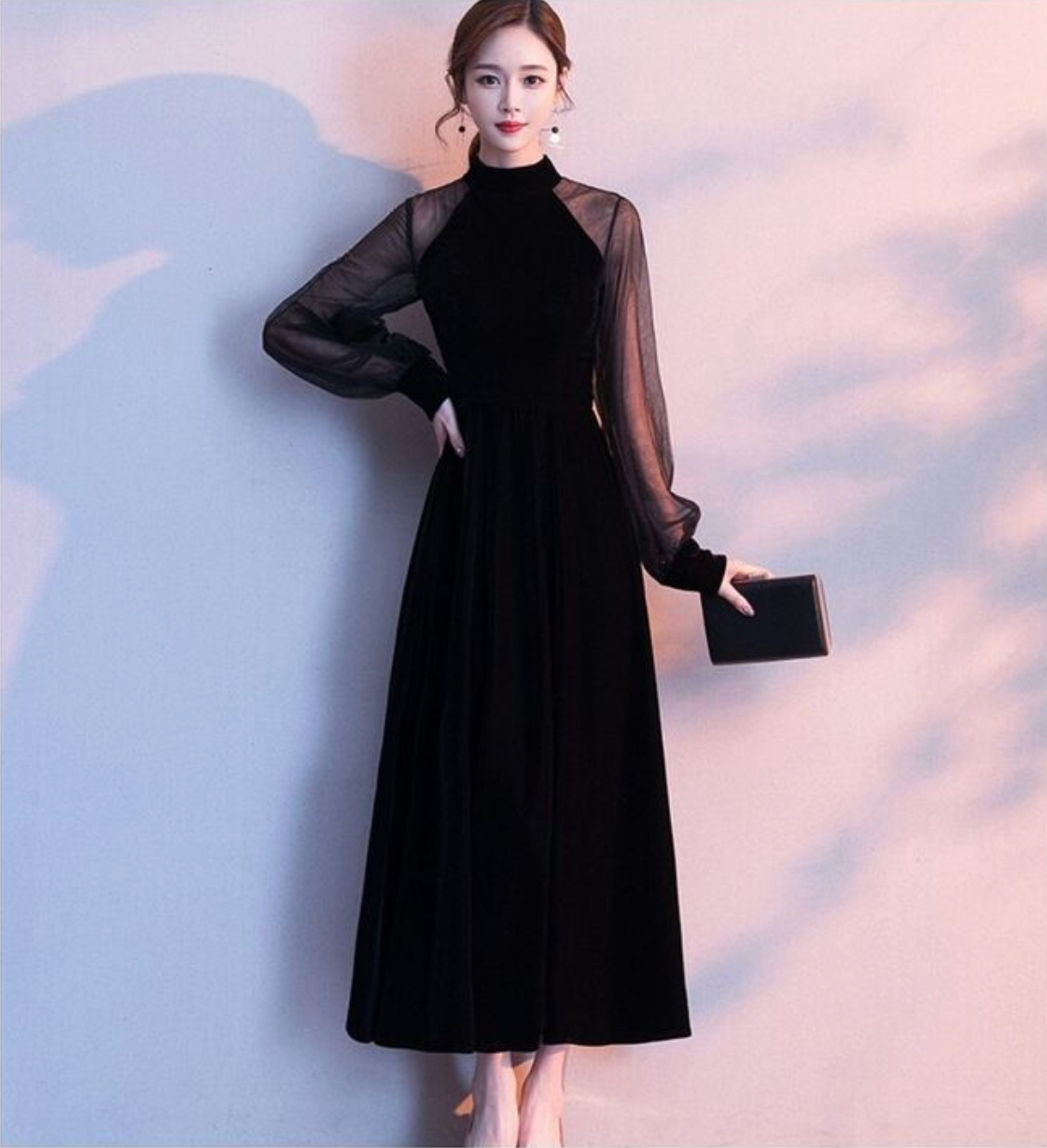 ホルターネック風で袖部分がシースルーになっているおしゃれなワンピースドレスです。シンプルながら上品で使いやすいアイテムです。