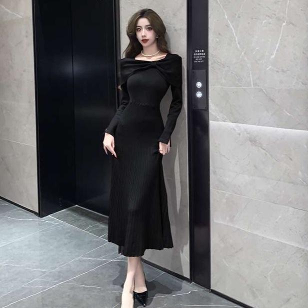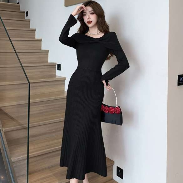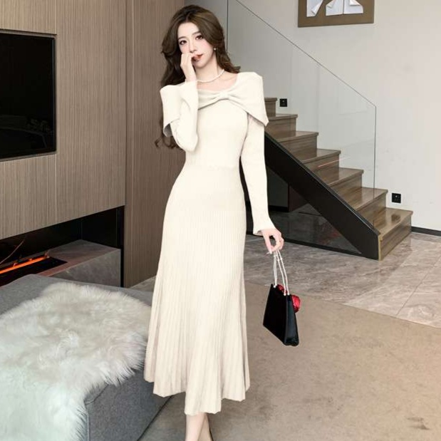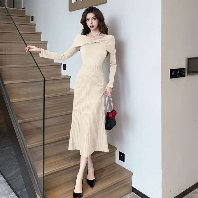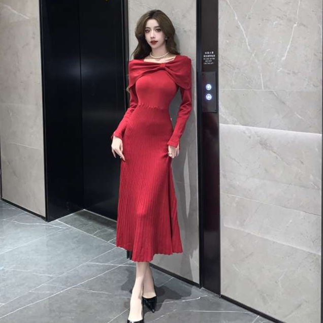 上品な襟元デザインと長めの着丈で、すらりとした印象を演出するリブニットワンピース。ウエストラインを美しく見せるシルエットと、フレアな裾周りで、結婚式やパーティーシーンに最適な一着。首元のパールネックレスが上品さを引き立てます。
