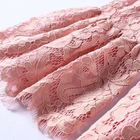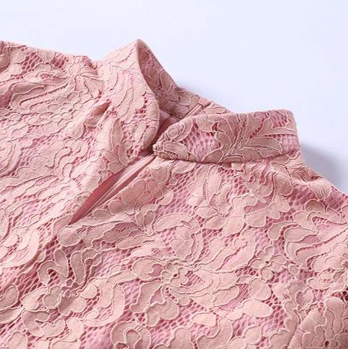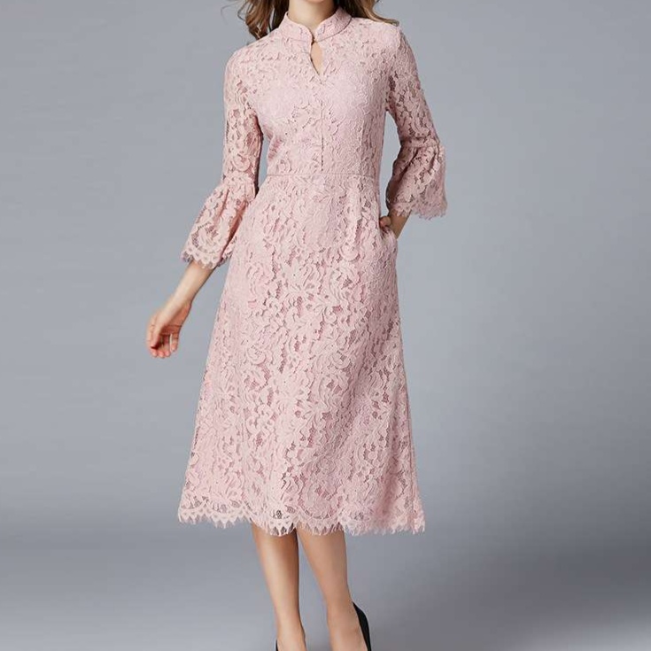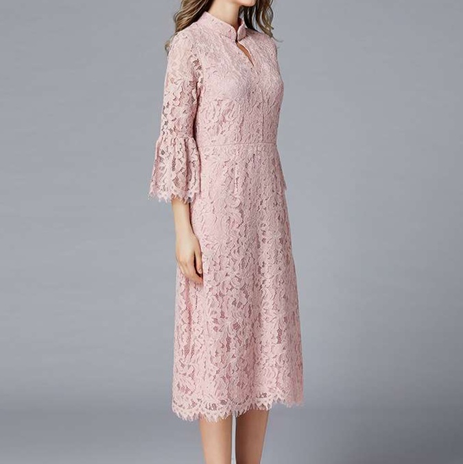 結婚式お呼ばれドレスとして最適なマキシワンピース。立ち襟のデザインと七分袖のシースルーレースが上品な印象を演出。
