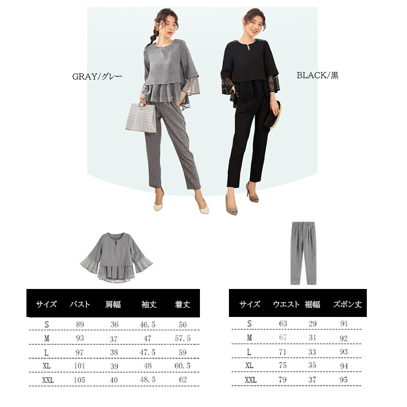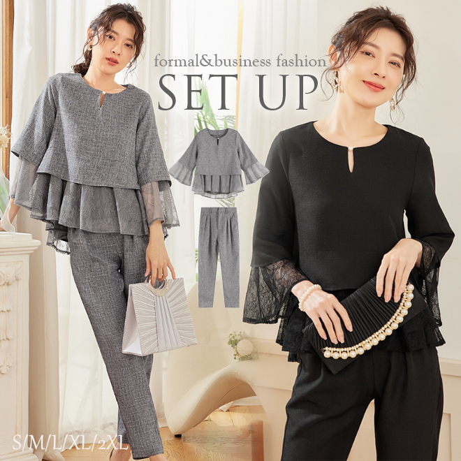 YouTubeショート動画があります! ■コメント ・高品質のフォーマル&ビジネスセットアップ。 ・上品な大人の雰囲気が漂います。 ・首元にあるパールでアクセサリーなしでも十分な装い。 ・ウエスト部分はペプラムデザインでウエストを細く見せ、女性らしいシルエットに仕立ててくれます。 ・後ろはファスナーを目立たせないデザインですっきりとしたバックスタイルに仕上げるコンシールファスナー。 ・大きなレースフリルつきの袖口でエレガントな雰囲気に◎。 ・ビジネスシーンからフォーマルシーンまで幅広く着用できる1着です ■サイズ(単位:約cm) 画像に記載 ■カラー 画像に記載 ■伸縮性 なし ■裏地 なし ■生地の厚さ 普通 ■透け感 なし ■素材 ポリエステル95%ポリウレタン5%