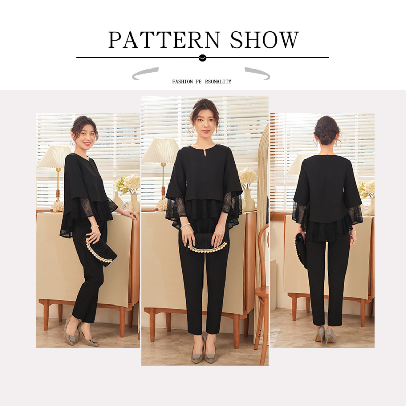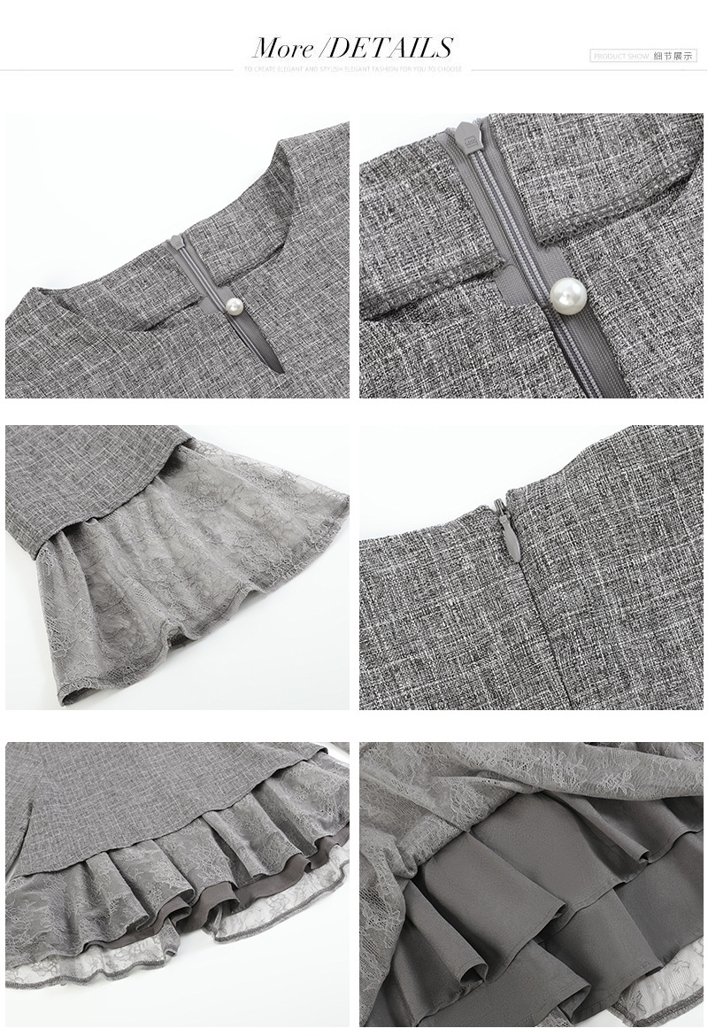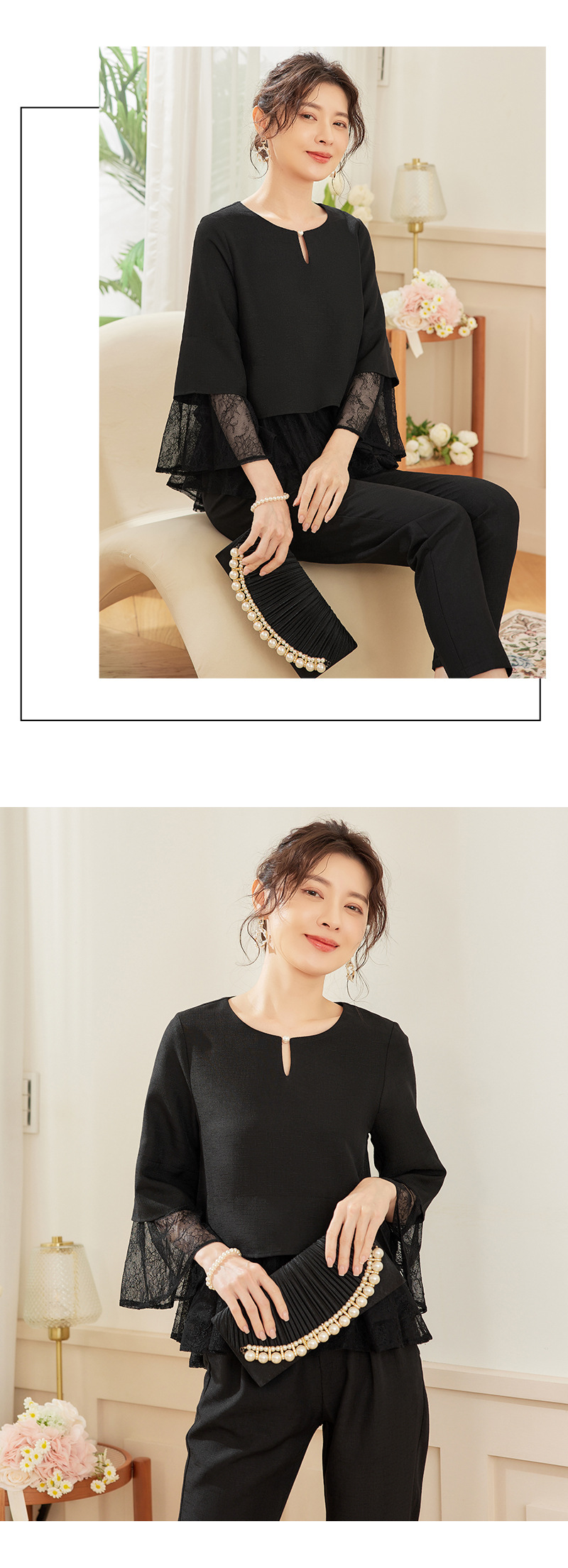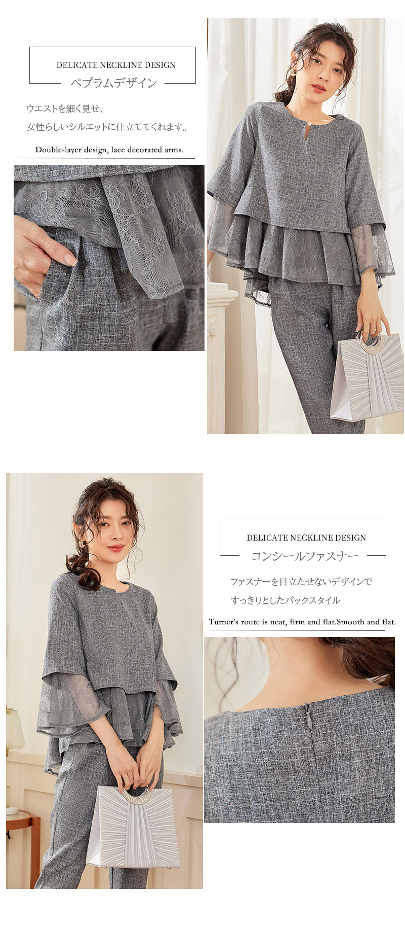 袖口の繊細なレースと重ね着風のペプラムデザインが上品な印象を演出。