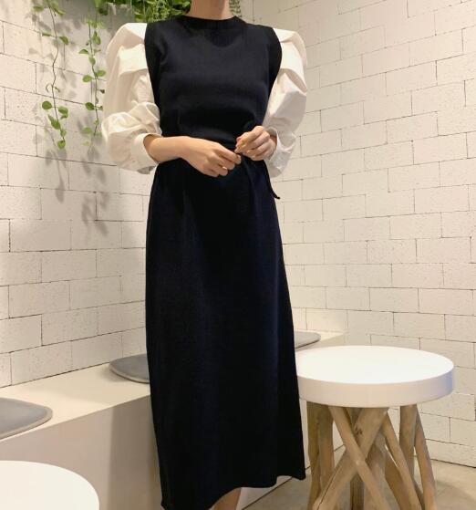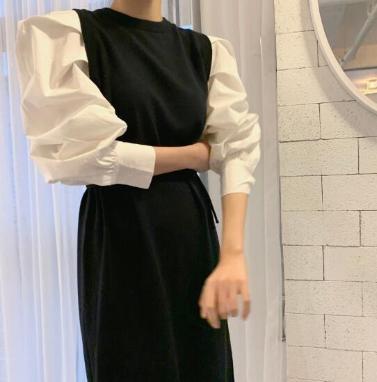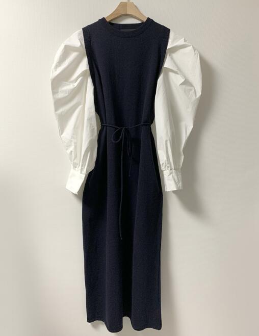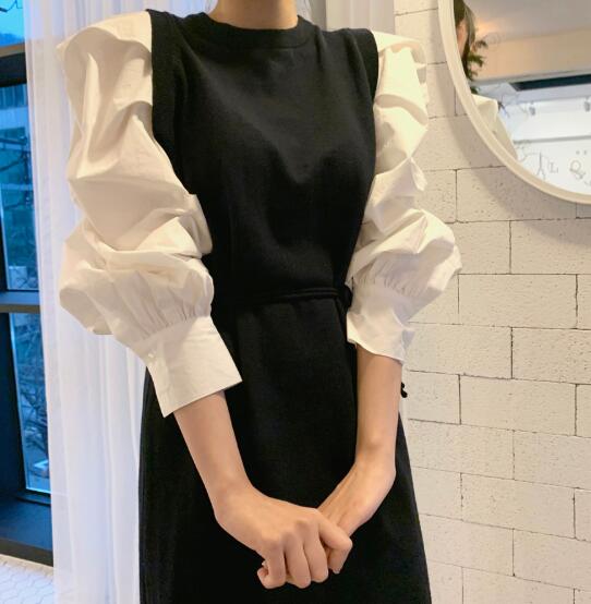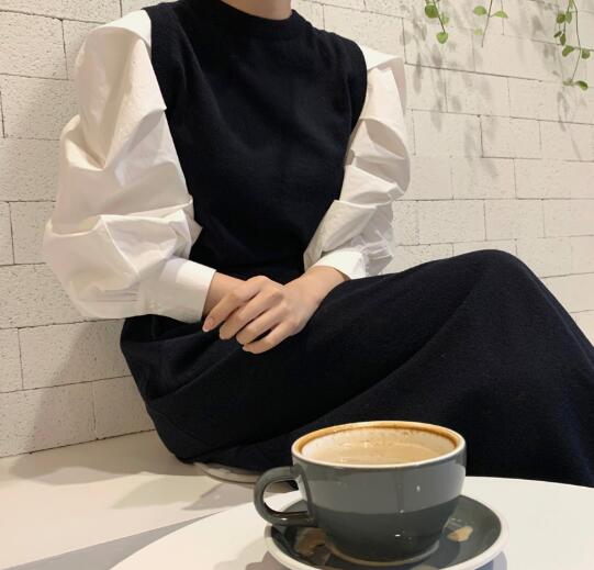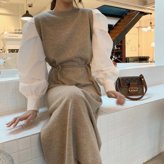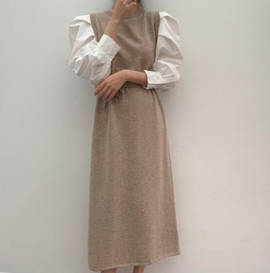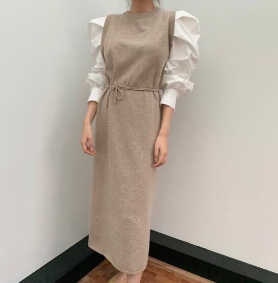ベージュのベストに白い袖がレイヤードされたおしゃれなデザイン。