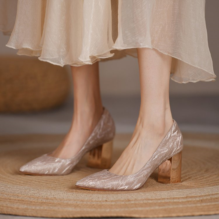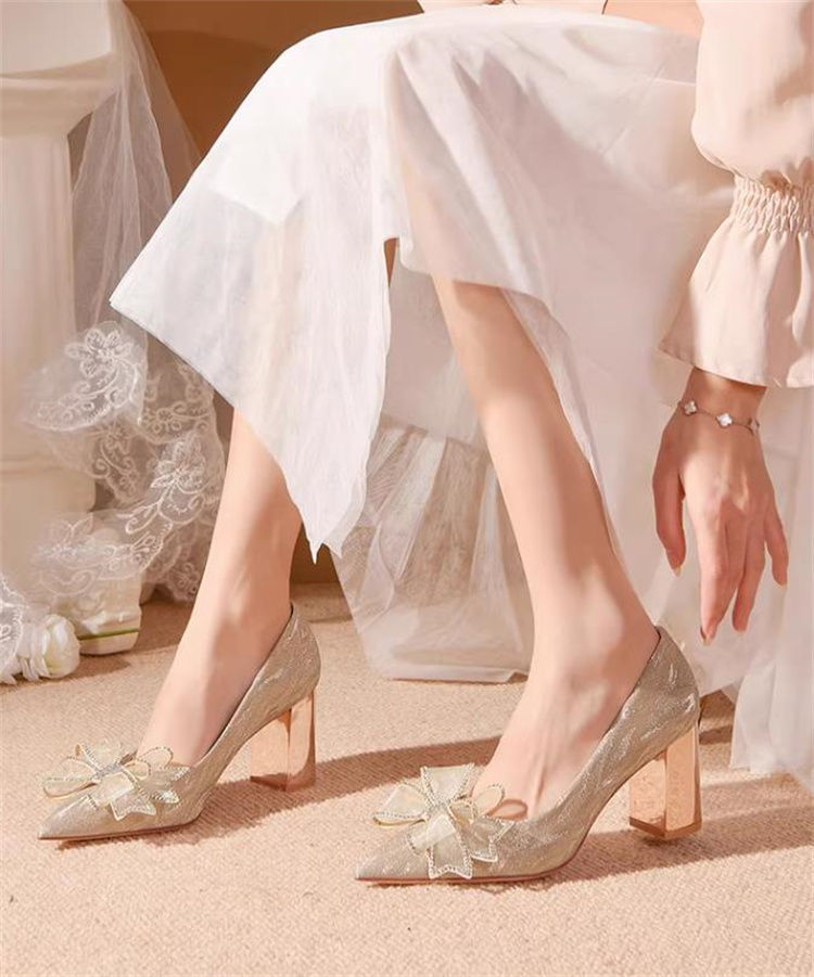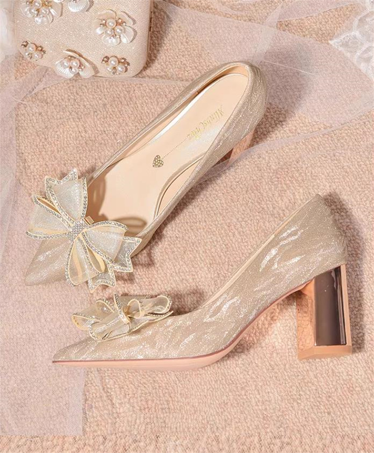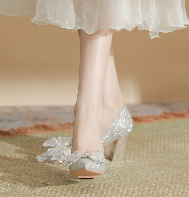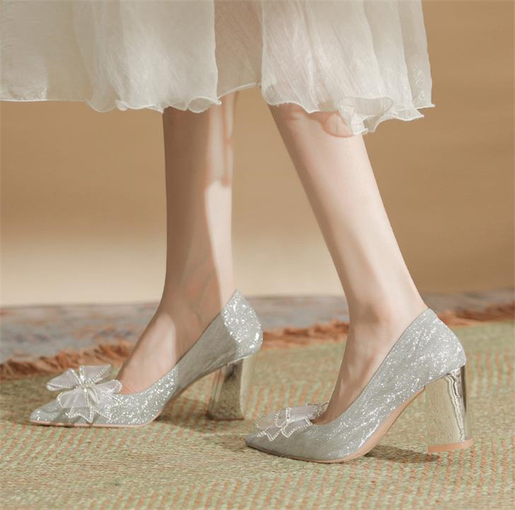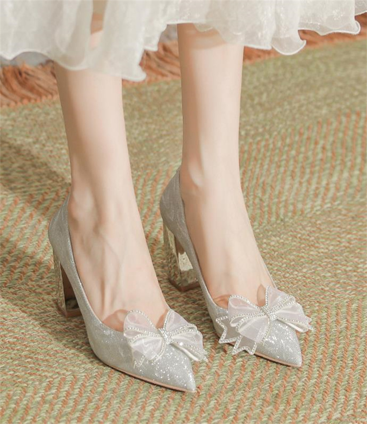 結婚式お呼ばれドレスに最適な上品な水晶調パンプスです。 先端がとんがったデザインと可愛らしいリボンが足元を華やかに演出します。 太めのヒールで安定感があり、長時間の着用も安心です。 カラー:銀色、薄金色の2色展開でお好みに合わせてお選びいただけます。