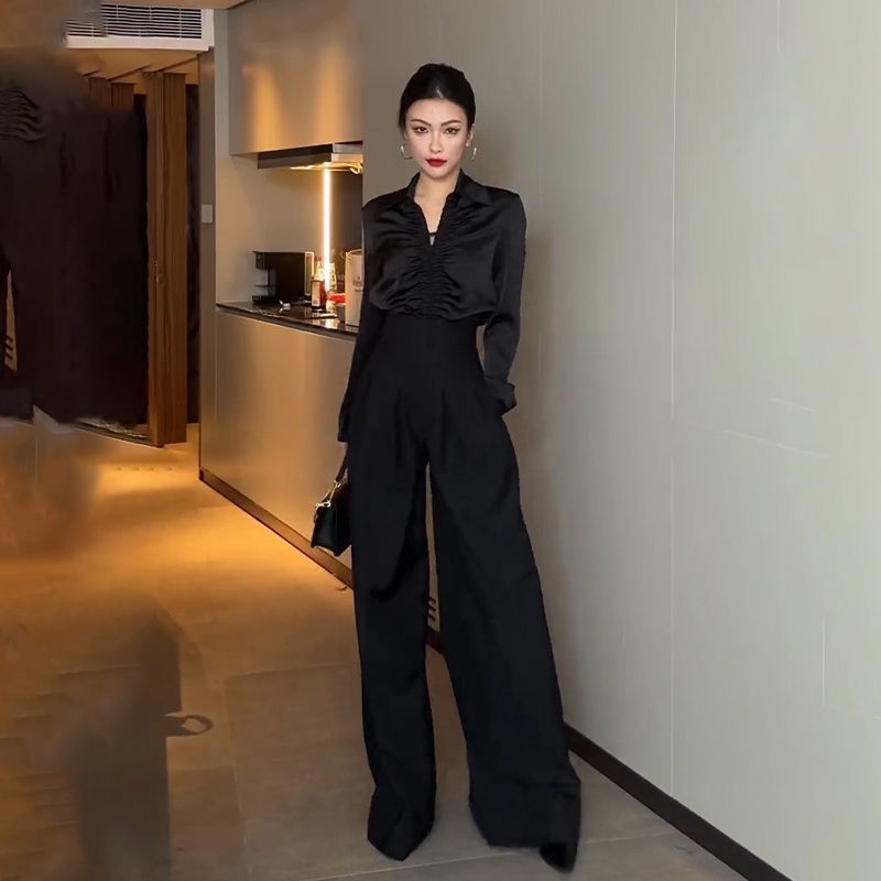 フロントのシャーリングデザインが華やかさを添えるブラウスと、すっきりとしたハイウエストのワイドパンツを組み合わせました。