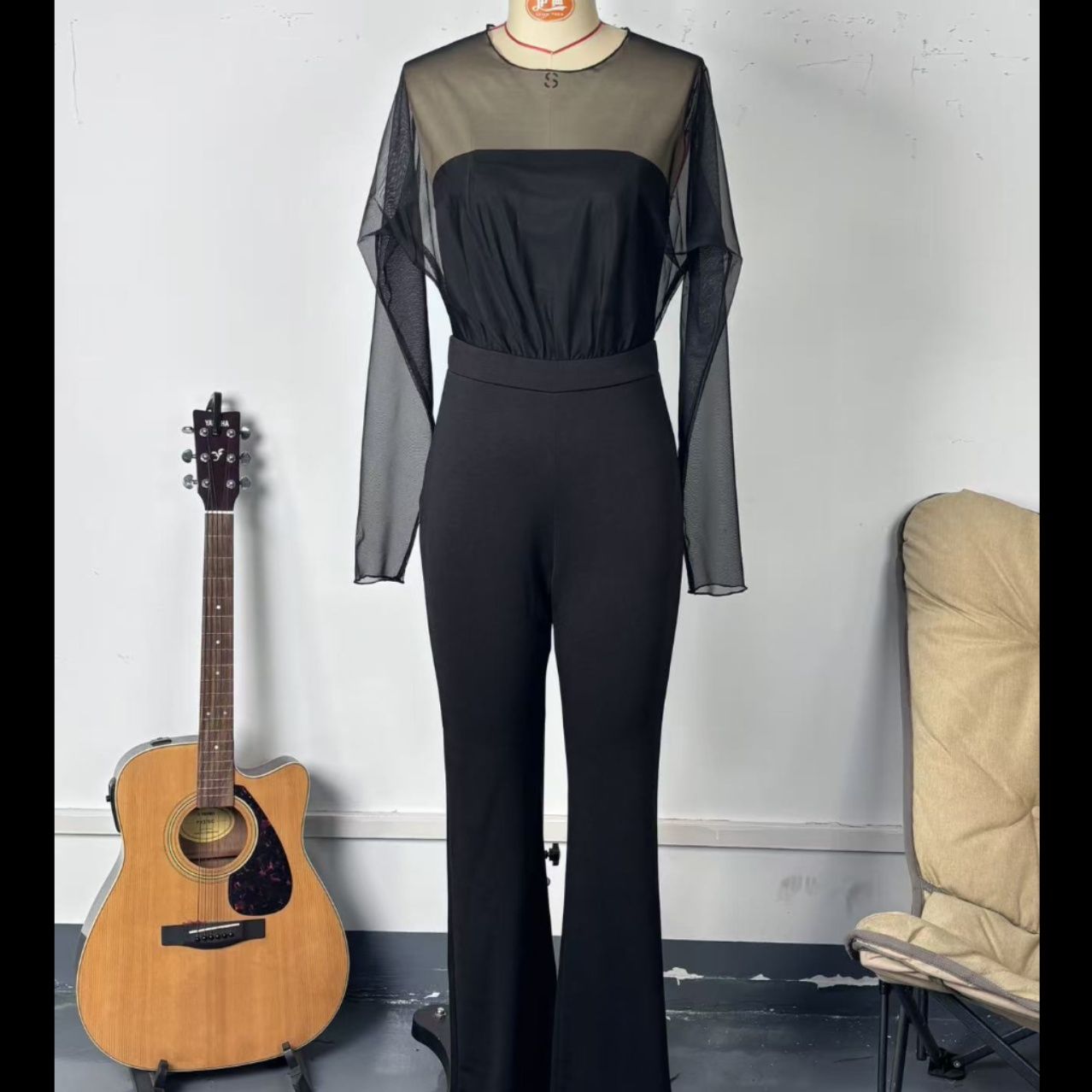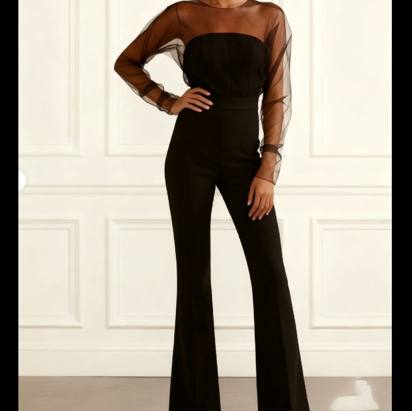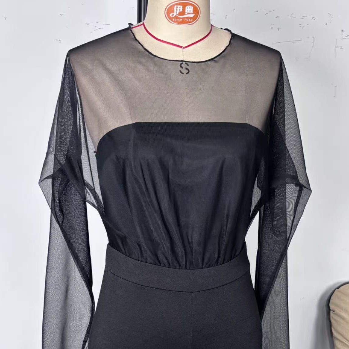 透け感のあるシアー素材の長袖とベアトップ風のインナーが絶妙に組み合わさり、上品でありながら華やかな印象を演出します。