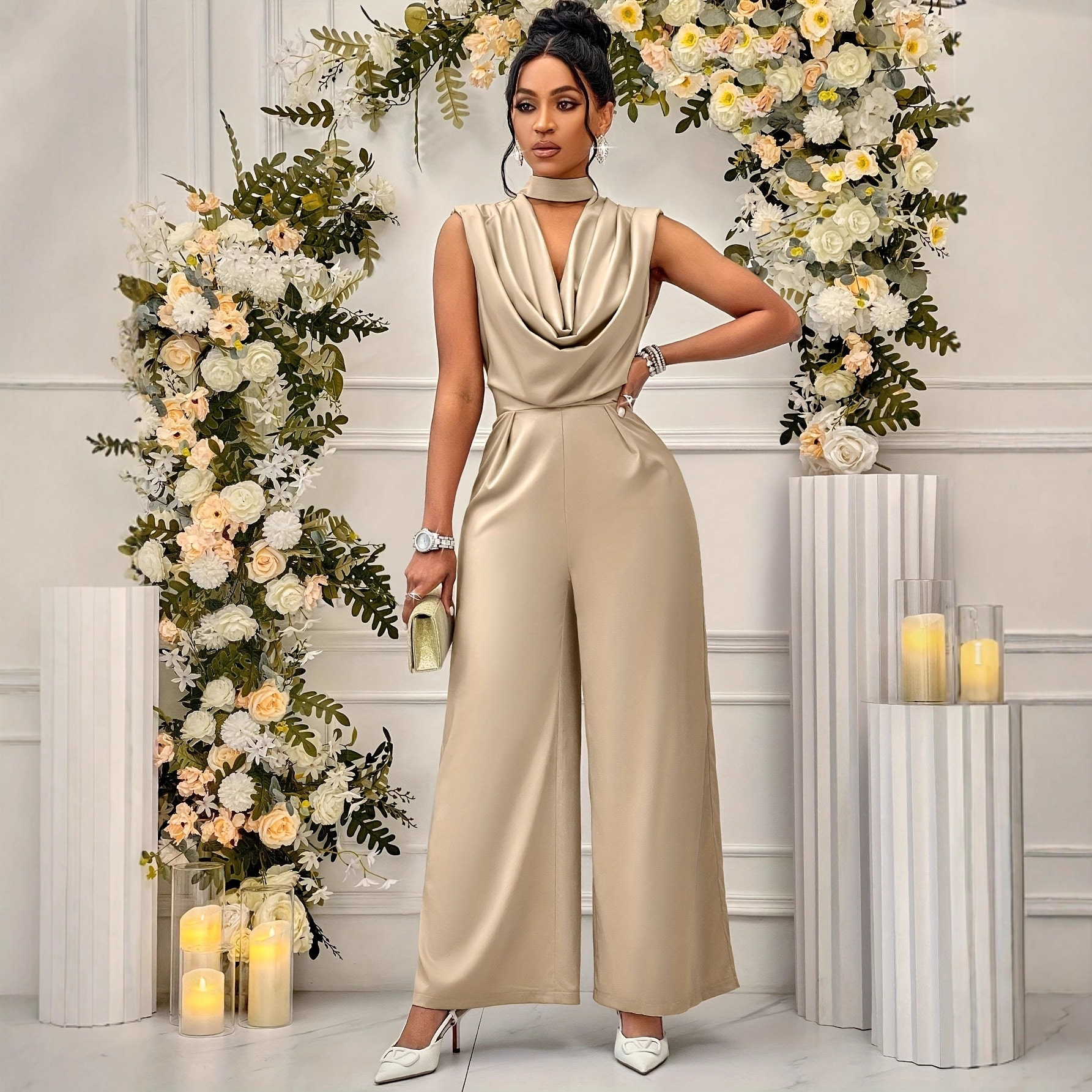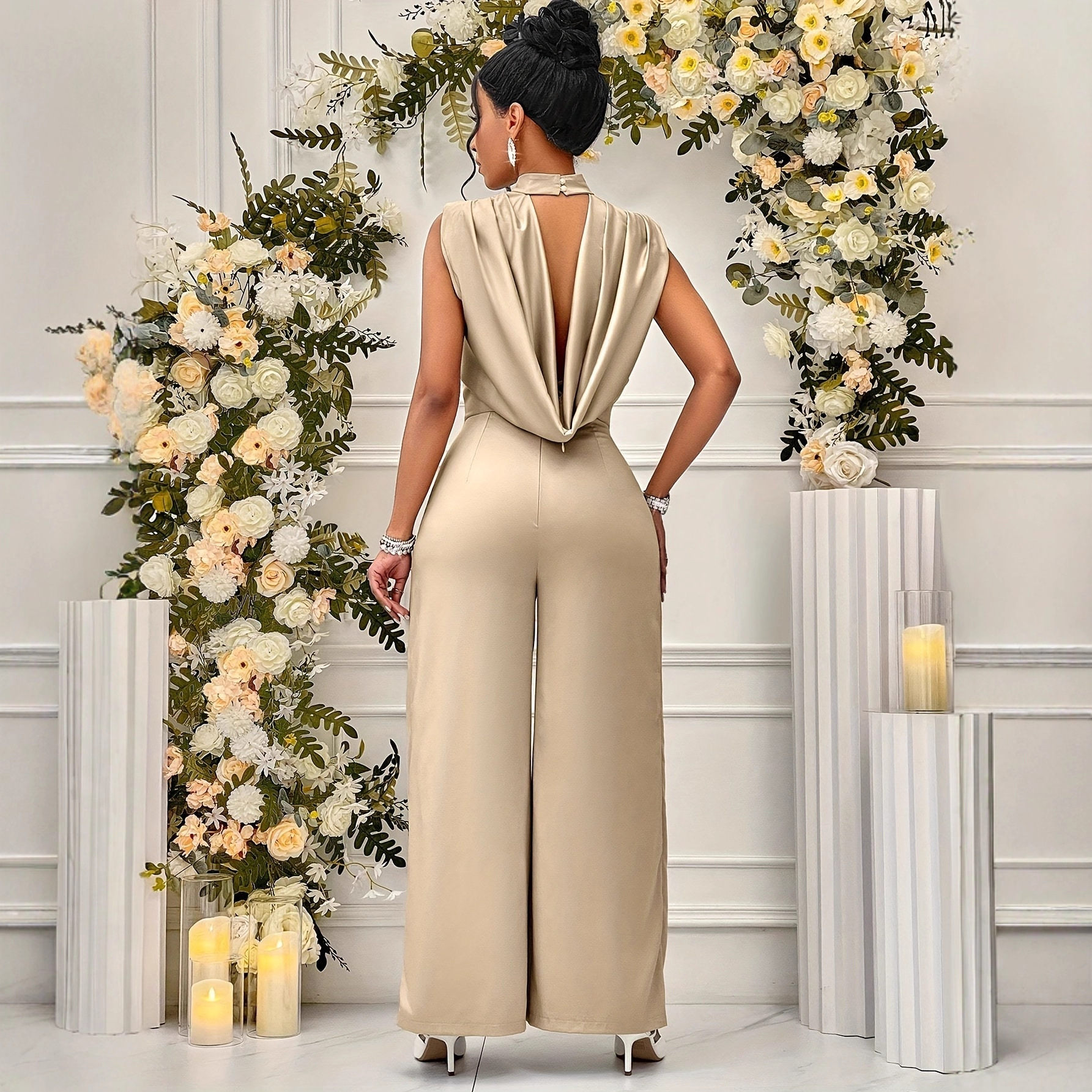結婚式お呼ばれドレスに最適な上品なパンツドレスです。 ドレープをたっぷりとあしらったカウルネックが華やかで、ノースリーブデザインがすっきりとした印象を与えます。 背中は大胆に開いたバックオープンデザインで、後ろ姿まで美しく演出します。 ワイドパンツのシルエットが脚長効果を発揮し、洗練された大人の装いを叶えます。 二次会やパーティーなど様々なシーンで活躍する一着です。