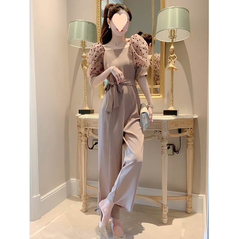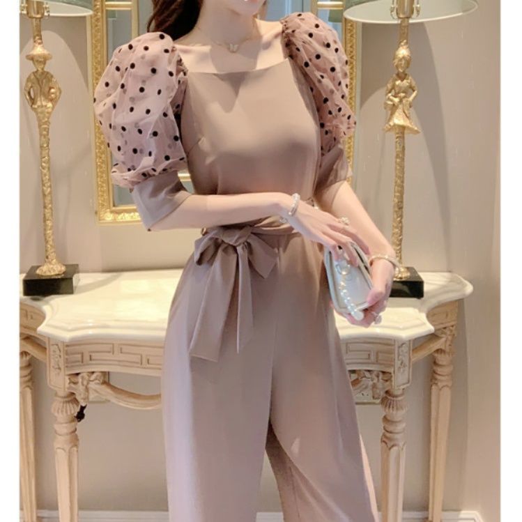 透け感のある水玉模様のチュール素材が袖を彩り、ふんわりとしたボリューム感が女性らしさを演出します。